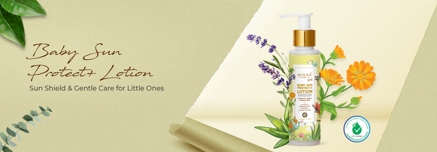 Alyuva Baby Sun Protect + Lotion is safe for babies older than 6 months. It is made using PUFA free oils like Shata Dhauta Ghrita (100 Times Washed Cow’s Clarified Butter), Coconut Oil, Avocado Oil and Red Raspberry Oil. Made using non-nano uncoated Zinc Oxide, it is broad spectrum with a SPF of 30+. Shields against not only UVB rays but also UVA rays and thus protects your baby from sunburns. It is Vitamin A and AHA free as these may increase sun sensitivity and cause cellular skin damage. Alyuva Baby Sun Protect+ Lotion is infused with exotic herbs like Calendula and Carrot Seed extract which are natural moisturizers, antioxidants and natural sun screens. Beeswax makes it non sticky and water resistant. The lotion is totally Chemical free, Paraben free, Alcohol free, 100% vegetarian, made from Natural & Herbal ingredients; suitable for kids and children above 6 months of age.