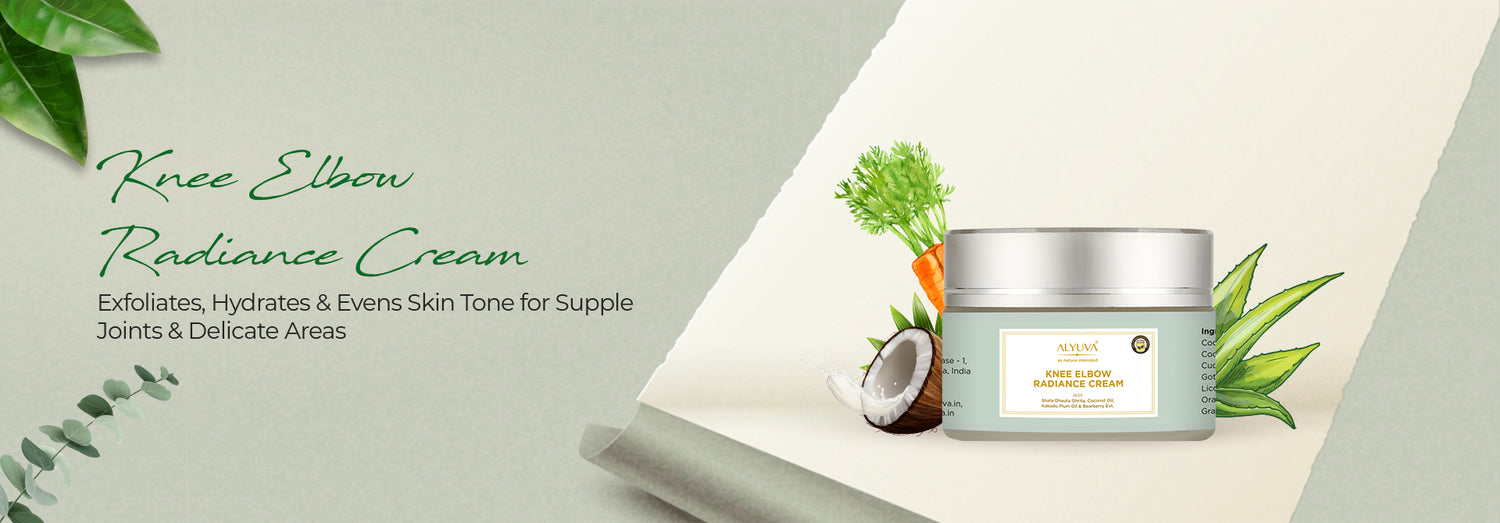Normally your elbows, knees and other sensitive areas are prone to getting dark due to the dust, pollution and neglect. Unlike face and hair, elbows and knees don’t get proper attention and nourishment and are prone to skin damage. Dark skin on the knees, elbows, underarms and other intimate parts is because of over production of melanin which is caused by wear and tear of skin cells. Alyuva Knee Elbow Radiance Cream removes dead skin cells and hydrates the skin to soften and smoothen the rough elbow, knee and other sensitive areas. It also helps in fixing those patches of dark skin and evens your skin tone. Gotu Kola prevents hyperpigmentation, Glycerin Hydrates and softens the skin, Licorice brightens the skin, Cocoa Butter moisturizes and smoothens the skin, Orange Peel, Lemon and Grape Fruit oils provide Vitamin C to nourish the skin and above all it contains Shata Dhauta Ghrita (100times washed Clarified Butter) which nourishes the skin from deep within and makes it smooth, radiant and healthy. Include this natural cream in your daily care routine and flaunt your flawless arms and legs fearlessly by wearing hot pants and sleeveless blouses.