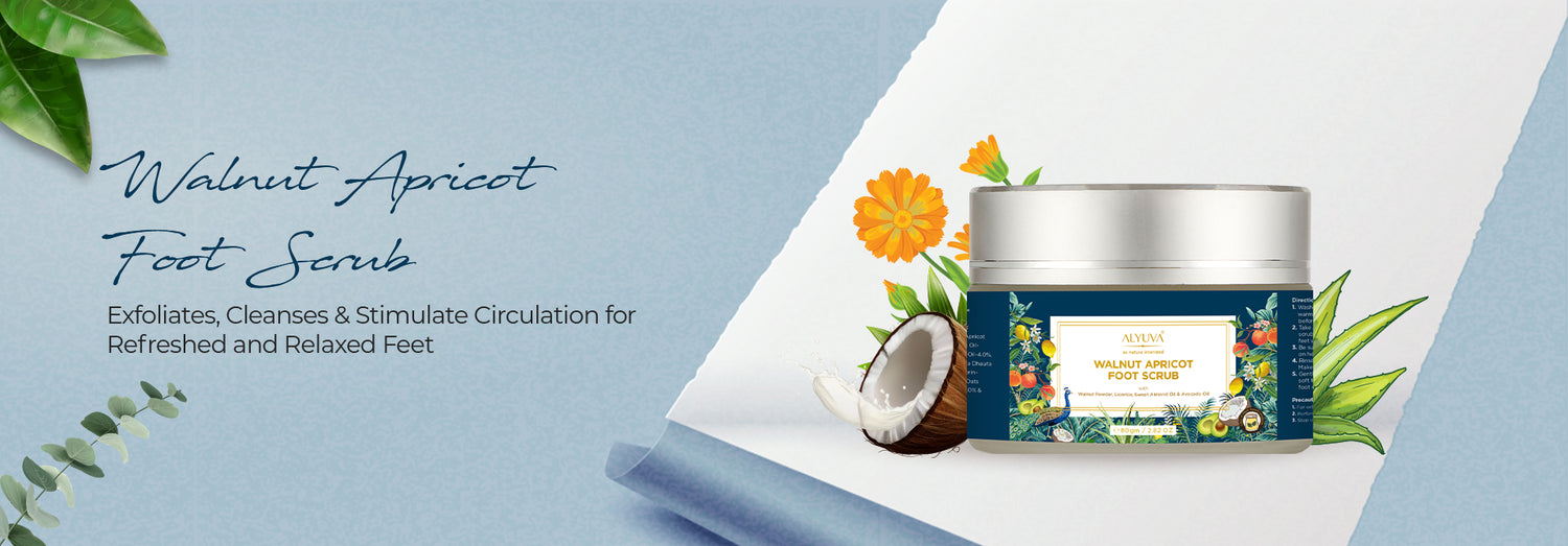 ALYUVA Walnut Apricot Foot Scrub is a herbal product made with Walnut and Apricot powders in a way that it gently exfoliates the skin, removes dead skin cells and the accumulated dust particles in the layers of the skin. The scrub is formulated with Avocado Oil, Sweet Almond Oil Coconut Oil which are all non- comedogenic oils and exfoliate, cleanse & moisturize the skin without clogging the pores. Alyuva foot scrub stimulates blood circulation to the feet which helps in relaxing the tired feet. Alyuva Foot Scrub is multi purpose scrub as it: