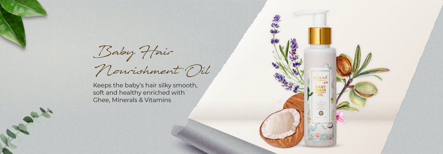 ALYUVA Baby Hair Nourishment Oil is a multipurpose hair oil for hair nourishment, hair growth, hair strength and scalp hygiene. Alyuva’s Baby Hair Oil is formulated with Shata Dhauta Ghrita (100 times washed Ghee), which helps other oils and herbs to penetrate deep into the hair roots and nourish hair follicles. Coconut oil not only moisturizes the hair but also helps eliminate cradle cap. Almond oil is a good source of Vitamin E, potassium, omega-3 fatty acid and magnesium, which help in nourishing and strengthening a baby's hair. Avocado Oil moisturizes the scalp and helps prevent dandruff and flaking. Amla and Bhringraj oils help in stimulating hair growth by preventing scalp itchiness & dandruff and provide natural shine to the hair. Lavender Oil has calming properties which help to relax a fussy baby and encourage sleep. Cedarwood essential oil is thought to promote hair growth and prevent scalp infections. Alyuva Baby Hair oil should be applied daily to the baby’s scalp to keep it healthy and stimulate healthy hair growth.
