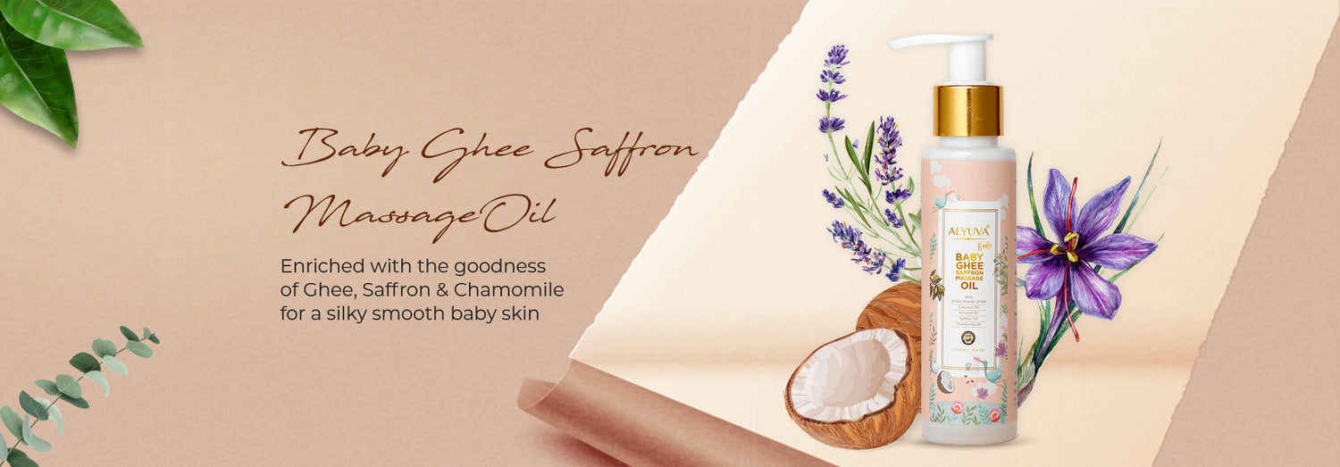ALYUVA Baby Ghee Saffron Massage Oil is formulated with 100 times washed Indian Cow’s clarified butter (Shata Dhauta Ghrita) which deeply penetrates through all seven layers of the skin to nourish it from within and keep the baby skin silky smooth and healthy. Coconut oil is antibacterial, antifungal and anti-inflammatory, contains powerful agents to protect the skin from potential pathogens. Almond oil is a natural moisturizer and a source of Vitamin E and Vitamin D. It also has anti-inflammatory properties and helps in healing damaged and dry skin. Saffron makes your baby's skin lighter, Chamomile has soothing and anti-inflammatory properties, Turmeric oil is anti-allergic, anti-bacterial, anti-microbial and anti-fungal, Lavender Oil has calming properties which help to relax a fussy baby and encourage sleep. Alyuva Baby Massage oil should be used daily before bath to relax and soothe the baby and make his skin smooth, bright and healthy.